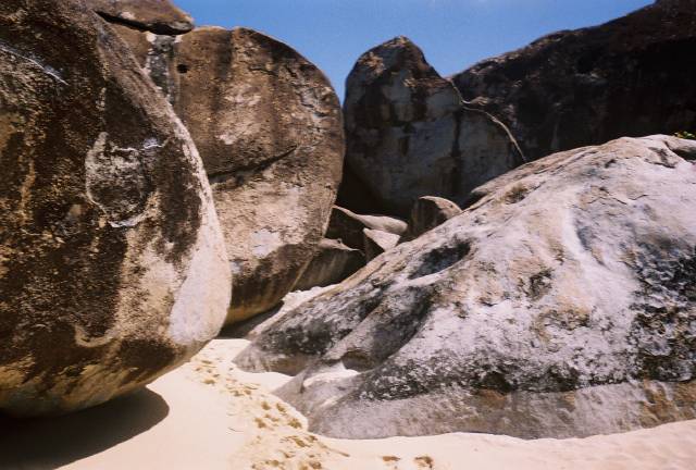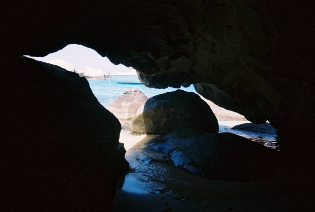 The next day we headed a bit south and took in the sights and did some snorkeling at The Baths. From there we headed southwest to Peter Island for a quick ice stop and then on to The Bight at Norman Island. Norman Island served as the setting for Robert Louis Stevenson's novel Treasure Island. We spent the night moored at the The Bight and dined at Willy T's, a 1890's vintage lumber schooner that's now a bar and restaurant. Joining the crowd on Willy T's was the immensely arrogant owner and his guests from the Darth Vader yacht, and a wedding party getting an early start on the celebration. The couple were getting married the following Saturday on the beach at the Bitter End Yacht Club on Virgin Gorda. Mom and Dad were expecting the socialite wedding of the year in Boston and got a barefoot wedding in the Caribbean instead. In the bride's words, "Mom isn't happy"....