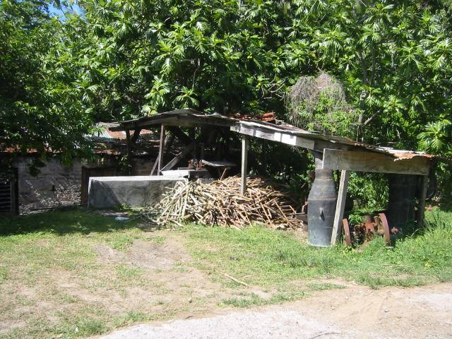 The sugar cane is piled up ready to be crushed. The juice runs down a sluice behind the little white wall into the building and is collected in a giant copper bowl for boiling.