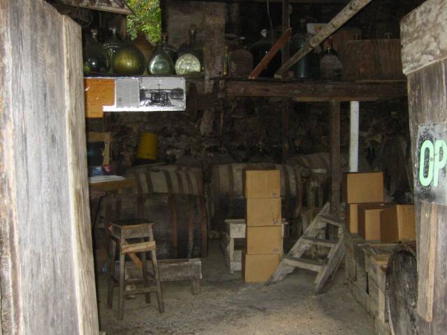 the distilled rum flows into the building where its bottled in the large glass bottles up top. then it's either bottled as white rum or aged in the oak barrels for 4 years where it mellows and picks up an amber color. I've had genuine Tennessee moonshine and the aged amber rum is just as potent. (My boss at Honeywell grew up in deliverance country in Tennessee and used to bring back real moonshine whenever he went home to visit)