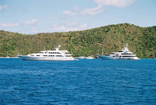 A couple of luxo barges anchored at The Bight, both were well over 200 feet long. The owner and his guests from the Darth Vader yacht on the right showed up at Willy T's. They were refueling at Peter Island when we stopped for ice. I counted a professional crew of at least 6, a gal serving champagne on the aft deck and the Captain and 4 other crew members were supervising the refueling.